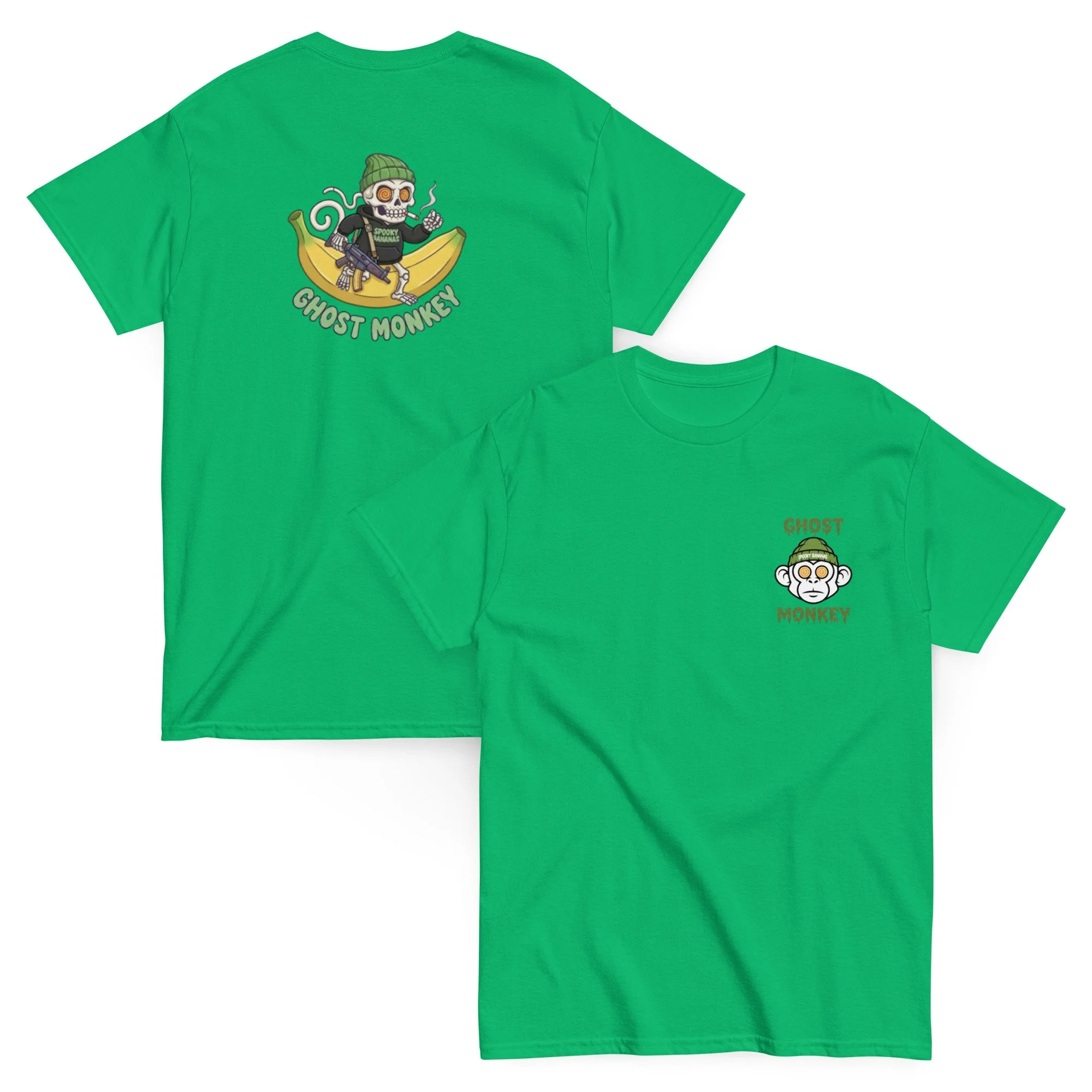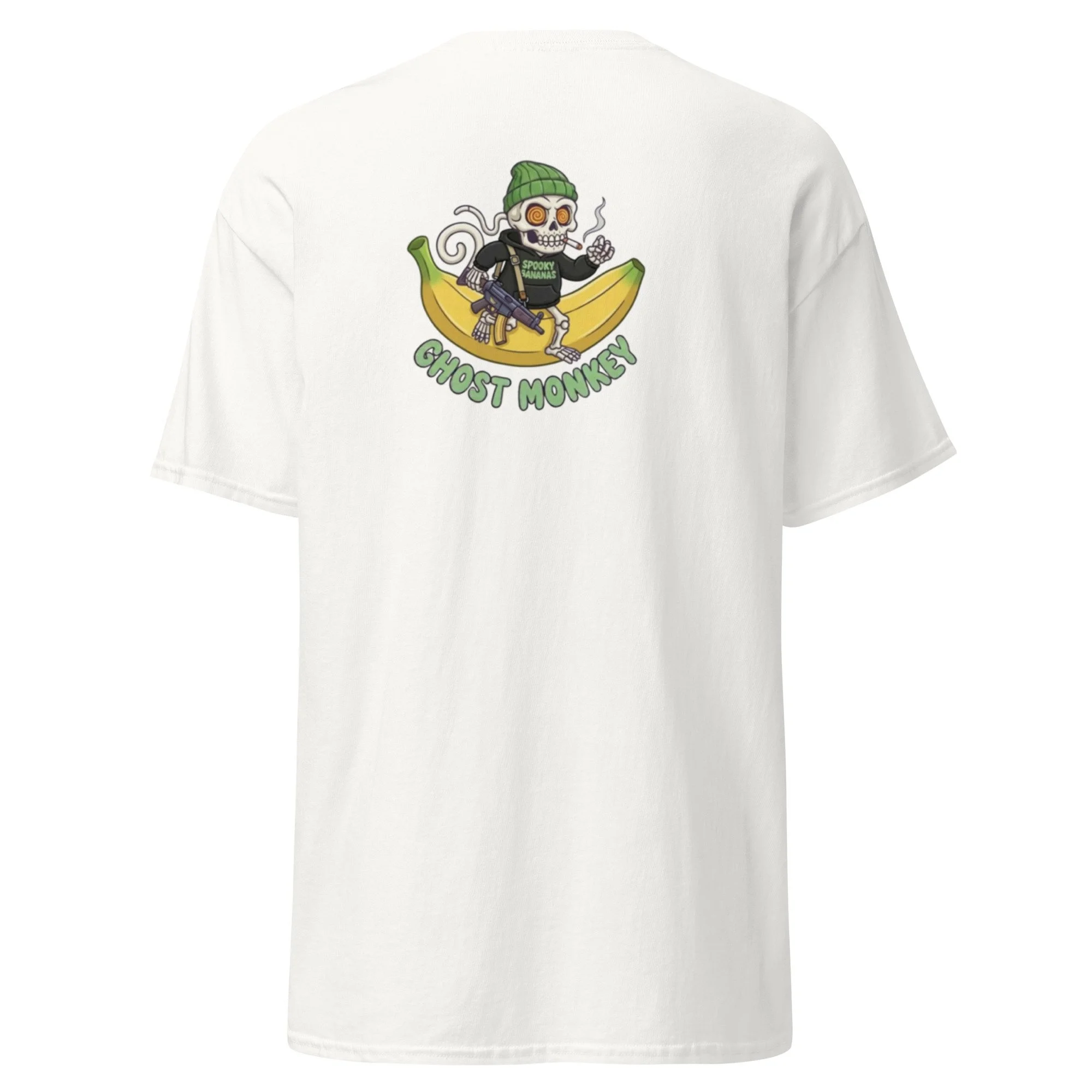A bold, chaotic, and unmistakably Ghost Monkey graphic that turns the back of the shirt into a full attitude statement. The design features the signature skeleton monkey with spiral eyes, rocking a green beanie and a “Spooky Bananas” hoodie, cigarette in hand and a purple weapon slung over the shoulder. It stands confidently on a giant banana, with GHOST MONKEY stamped below in loud, toxic‑green lettering.